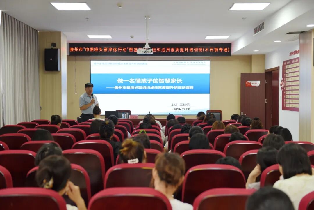 7月19日,滕州市“巾帼领头雁淬炼行动”暨基层妇联组织成员素质提升培训班(木石镇专场)成功举办。木石镇妇联执委成员、各村妇联主席55人参加培训。 培训班上,邀请中和社工理事长、国家二级心理咨询师、山东省家庭教育专家王桂桐老师以《做一名懂孩子的智慧家长》为题,从“依法带娃——父母的主体责任”“科学育娃——读懂孩子的行为”“厘清界限——经营好家庭关系”三个方面,用通俗易懂的语言为大家讲解了家庭教育中存在的问题、外在环境对孩子的影响、父母的责任有哪些等内容,通过现场互动、结合典型案例的方式帮助大家树立正确的家庭教育观念。