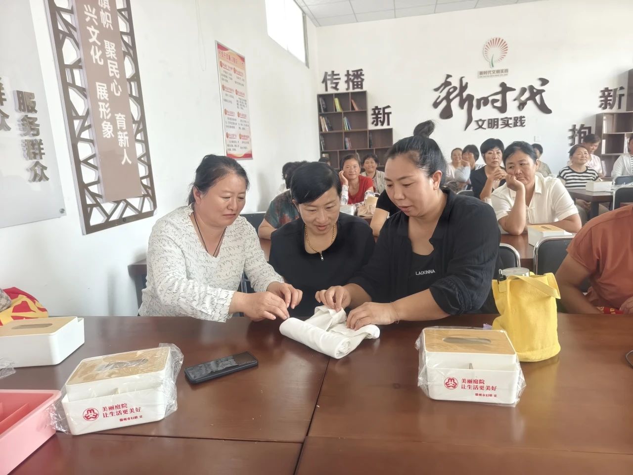 在课程中,孙老师从多个方面进行了教学培训。她讲解了不同物品的分类方法,让村民们学会将衣物、杂物、厨具等进行合理分类。同时,传授各种收纳工具的使用技巧,如收纳箱、衣架、抽屉分隔板等。孙老师还通过实际演示,让村民们更加直观地学习如何进行收纳整理。展示如何折叠衣物可以节省空间,如何利用角落空间进行收纳等。参加培训人员也纷纷跟着老师一起动手学习收纳折叠衣物,活动受到大家的一致好评!