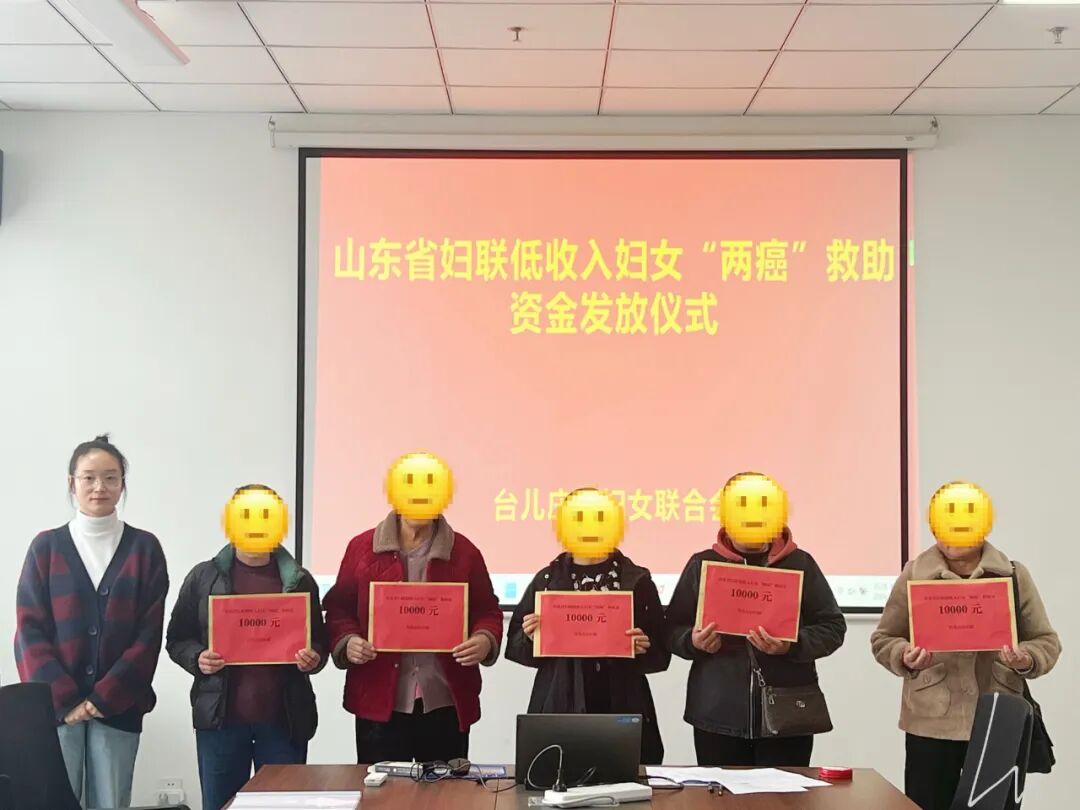 11月5日,台儿庄区妇联举行山东省妇联低收入妇女“两癌”救助金发放仪式,为我区5名符合救助条件的低收入“两癌”妇女发放救助金共计5万元。