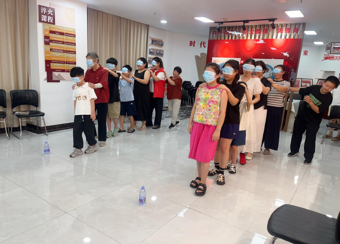 最考验信任与默契的“我是你的眼”环节,现场用矿泉水瓶摆成S型障碍路线。孩子们分组后,部分人蒙上双眼扮演“盲人”,另一人作为“拐杖”全程禁声,仅通过肢体动作引导队友避开障碍。黑暗中的每一步试探,都依赖着“拐杖”的细心指引;谨慎的每一次触碰,都承载着“盲人”的全然信任。随后的角色互换,更让孩子们在“被守护”与“守护他人”的体验中,深刻体会到信任的重量与责任的意义。