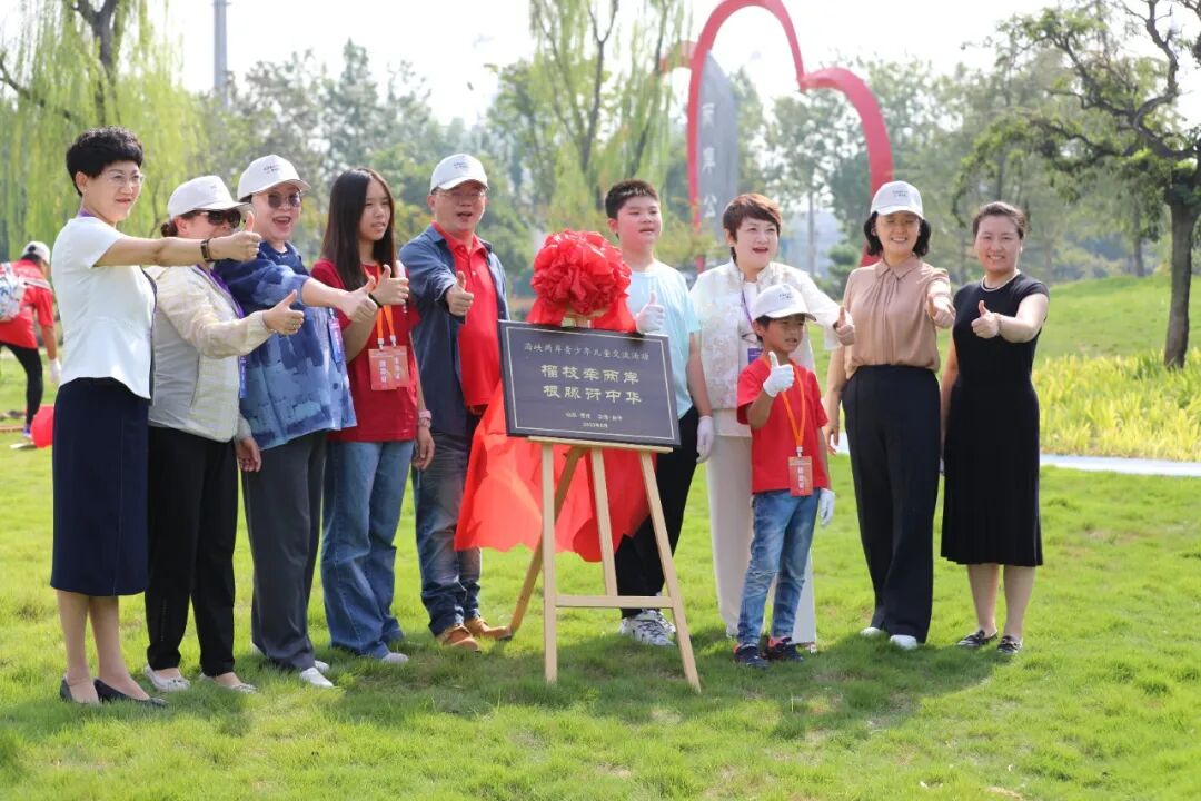 两岸青少年一起在两岸公园种下象征民族团结的石榴树,并为“榴枝牵两岸 根脉衍中华”牌匾揭牌。