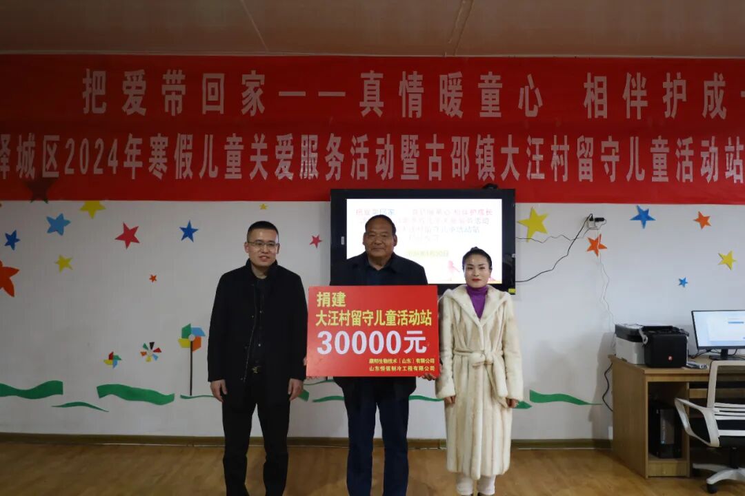 康那生物技术(山东)有限公司执行董事李梅,山东恒信制冷工程有限公司总经理郝培建向大汪村留守儿童活动站捐赠价值三万元的儿童设施及物品。