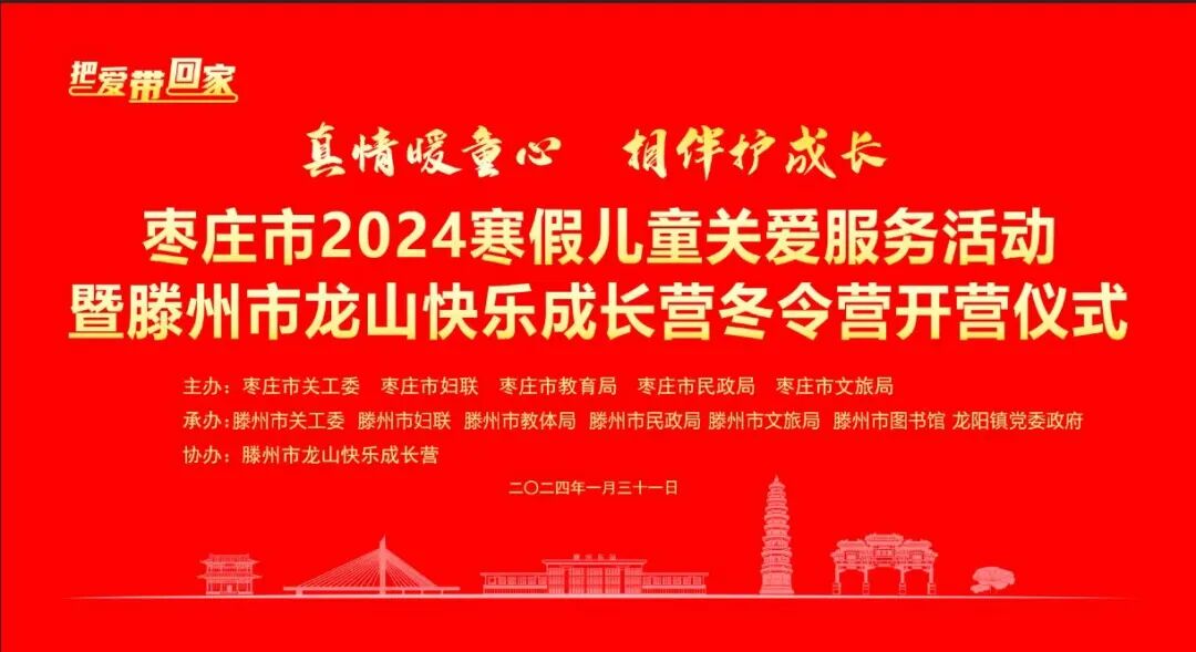 天地春晖近,日月开新元。为深入学习贯彻党的二十大精神和习近平总书记关于儿童和儿童工作重要指示,认真落实中国妇女十三大部署,汇聚各方力量做好寒假儿童关爱工作,让孩子们度过一个安全健康、温暖祥和的快乐假期,1月31日,“把爱带回家——真情暖童心 相伴护成长”枣庄市2024寒假儿童关爱服务活动暨滕州市龙山快乐成长营冬令营开营仪式在滕州市龙阳镇龙山快乐成长营举行。