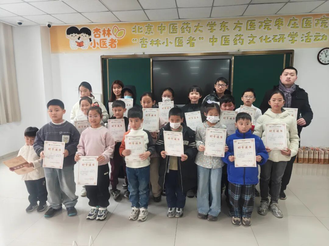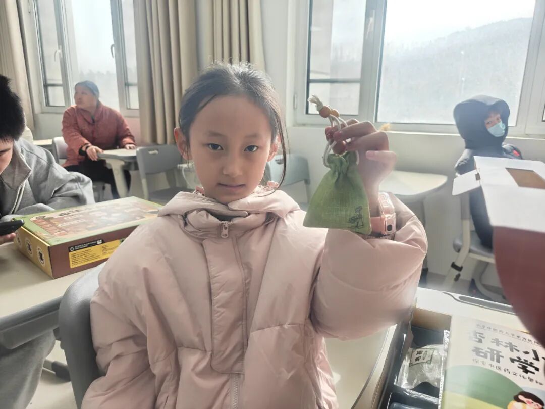 活动尾声,孩子们满怀自豪地分享本次研学的收获与感悟,现场展示了亲手制作的精美香囊作品。北京中医药大学东方医院枣庄医院为孩子们颁发了“中医小达人”研学证书,并送上精心准备的新春爱心礼包,用温暖与鼓励为本次活动画上圆满句号。现场暖意融融,处处洋溢着温馨与感动。